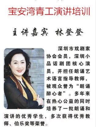 著名朗诵家、演讲家林登登老师主讲,战训内容为演讲技巧培训并组织现场演练,通过战训来遴选、锻炼宝安湾青工演讲团团员,为后续开展巡回演讲作好人才储备。